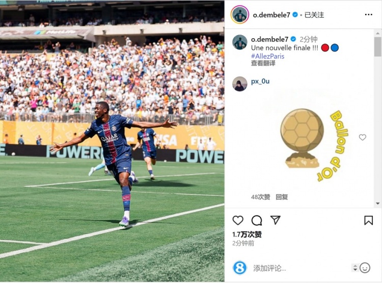 金球穩(wěn)了?登貝萊本場(chǎng)傳射&社媒慶祝晉級(jí):又一場(chǎng)決賽!
