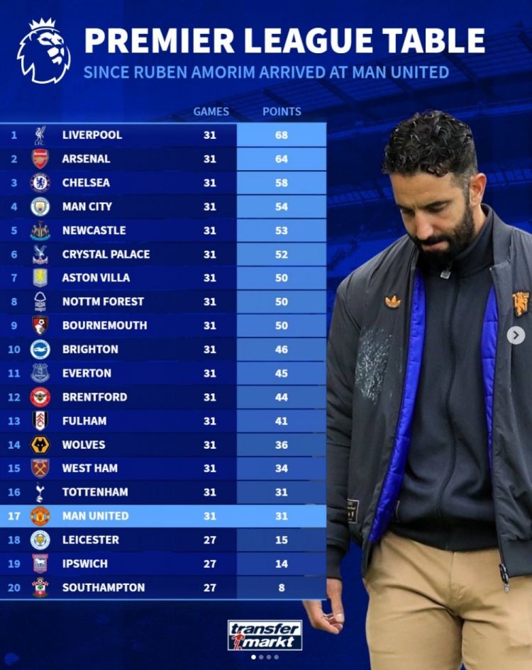 德轉(zhuǎn)列自阿莫林執(zhí)教曼聯(lián)以來各隊(duì)在英超取得的積分情況,阿莫林帶隊(duì)31輪僅取得31分,僅高于上賽季三支英超降級(jí)隊(duì),距第1名31輪取得68分的利物浦相差37分。
