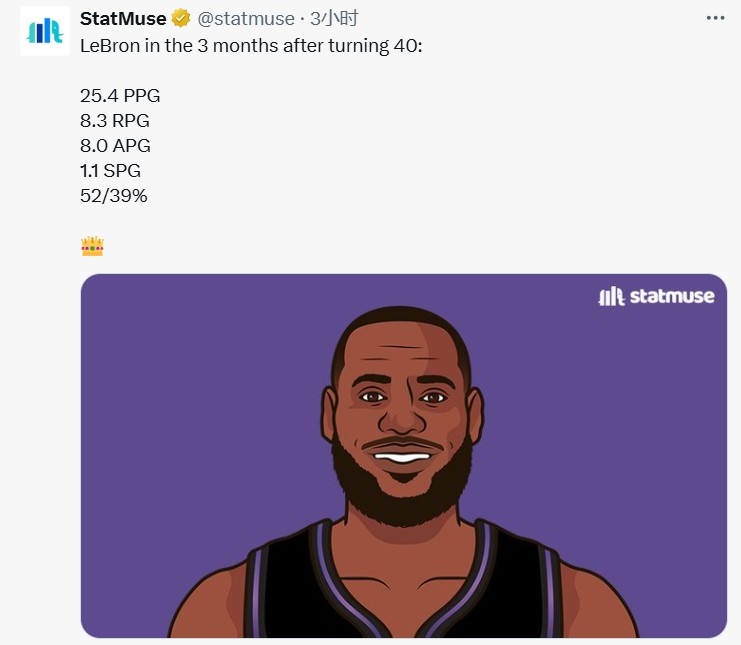 8月9日訊 今日數(shù)據(jù)媒體StatMuse曬出詹姆斯年滿40歲之后3個(gè)月的場(chǎng)均數(shù)據(jù),并配文:??。