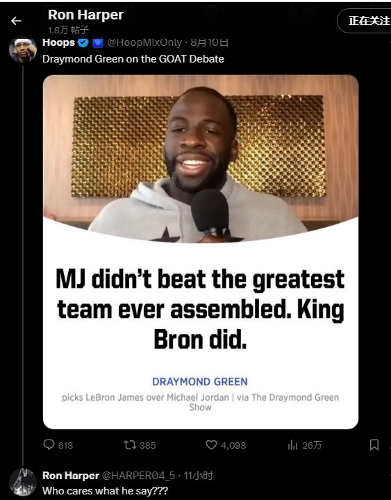 8月11日訊 此前,追夢(mèng)曾在播客節(jié)目中將老詹排在其個(gè)人歷史榜單前五,位置在喬丹之前,因?yàn)閱痰]擊敗過史上最偉大的球隊(duì),但詹姆斯做到了(擊敗了2016年的勇士)。對(duì)此喬丹前隊(duì)友羅恩-哈珀發(fā)文回應(yīng)了追夢(mèng)的言論。