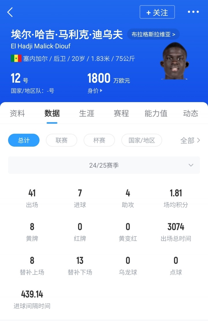 迪烏夫,現(xiàn)年20歲,塞內(nèi)加爾左后衛(wèi),上賽季代表捷甲球隊布拉格斯拉維亞出戰(zhàn)41場比賽,貢獻(xiàn)7球4助,球員德轉(zhuǎn)身價1800萬歐。