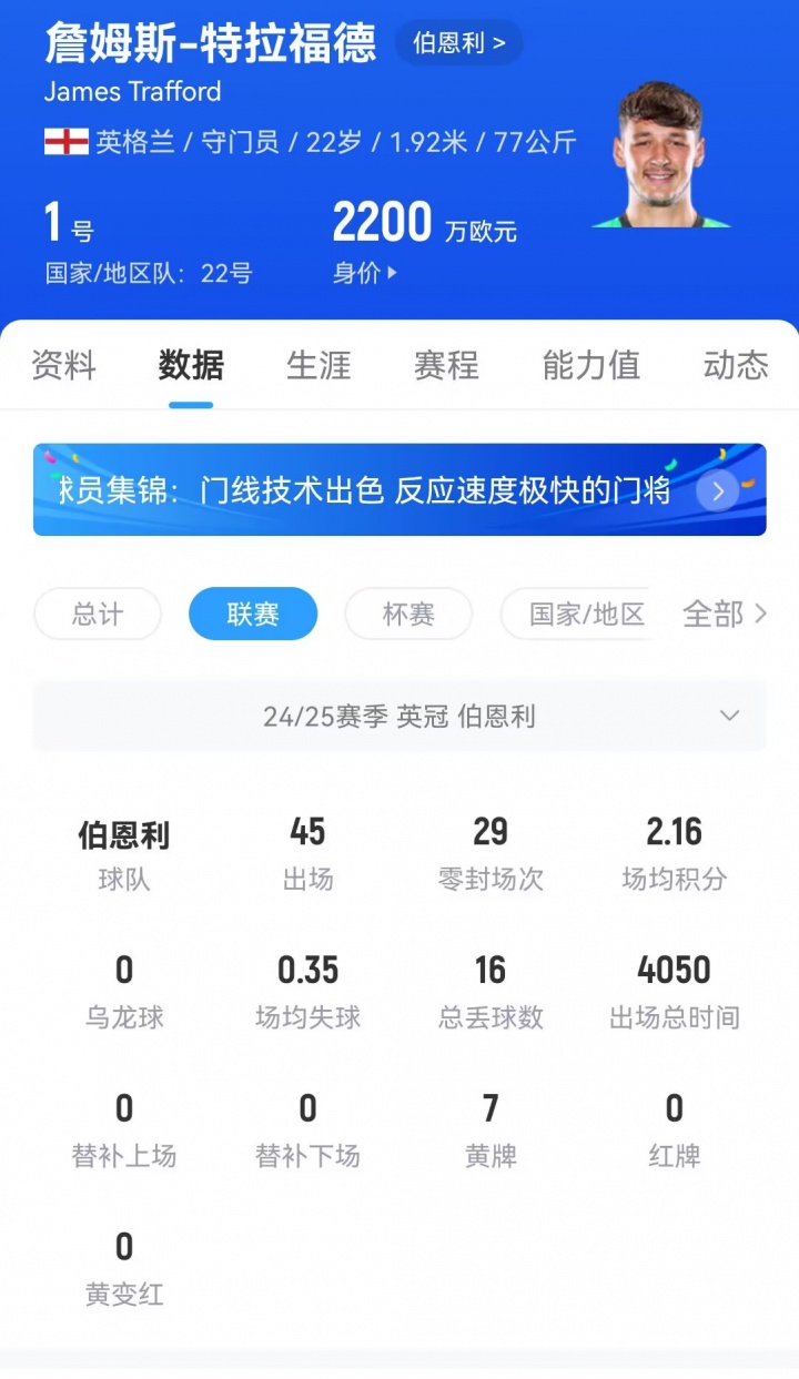 22歲的特拉福德上賽季為伯恩利在英冠出場45次,貢獻29場零封。球員目前的身價為2200萬歐元,有消息稱曼城有意將其回購。