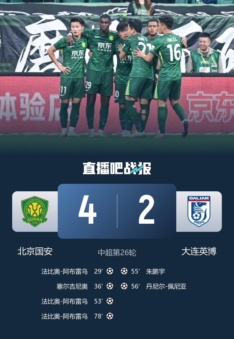 下半場補時7分鐘。最終全場比賽結(jié)束,北京國安4-2大連英博。