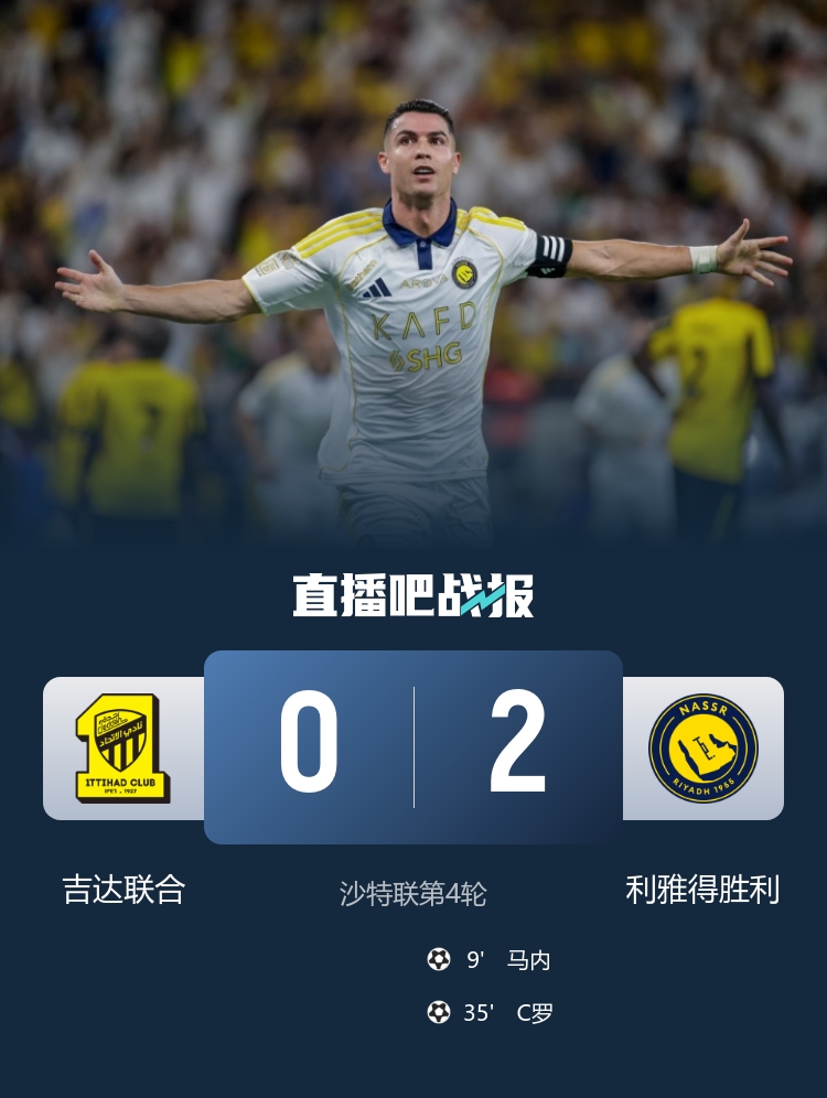 9月27日訊 沙特聯(lián)第4輪,吉達聯(lián)合坐鎮(zhèn)主場迎戰(zhàn)阿卜杜拉國王體育場迎戰(zhàn)利雅得勝利。上半場,馬內(nèi)傳射,C羅頭槌破門生涯第946球!易邊再戰(zhàn),C羅錯失空門良機。最終利雅得勝利2-0客勝吉達聯(lián)合。積分榜方面,勝利4連勝領(lǐng)跑,吉達聯(lián)合9分第二。