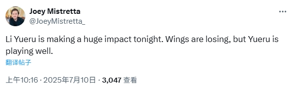 賽后,飛翼跟隊(duì)記者和媒體都發(fā)文稱贊李月汝的表現(xiàn)——跟隊(duì)記者Joey Mistretta:李月汝今天發(fā)揮出巨大作用。飛翼輸了,但李月汝打得很好。
