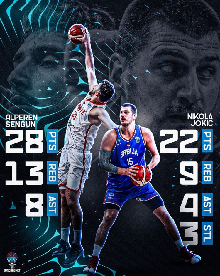 賽后,歐錦賽官方發(fā)布申京VS約基奇數(shù)據(jù)海報,并寫道:“我們剛剛目睹了歐錦賽歷史上最精彩的對決之一,申京VS約基奇!”