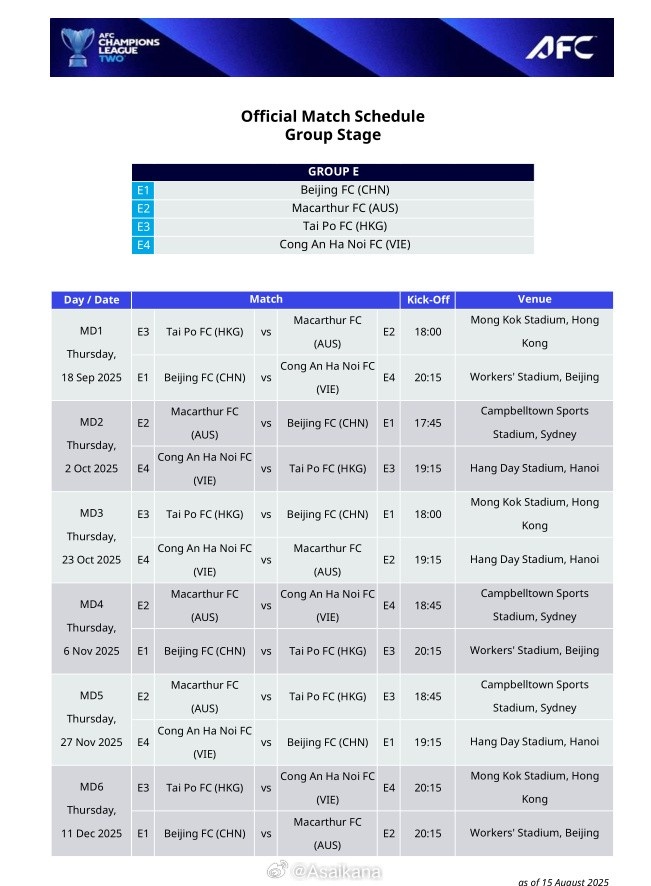 亞足聯(lián)官網(wǎng)今日早些時候上傳的亞冠二級聯(lián)賽賽程更新是不正確的,北京國安的賽程實際并未有變化(更新僅為其他小組標黃部分內(nèi)容),第一場仍為主場對河內(nèi)公安的比賽,估計是亞足聯(lián)工作失誤誤傳了錯誤版本。賽程以中國足協(xié)8月25日在官網(wǎng)發(fā)布的版本為準。 ???