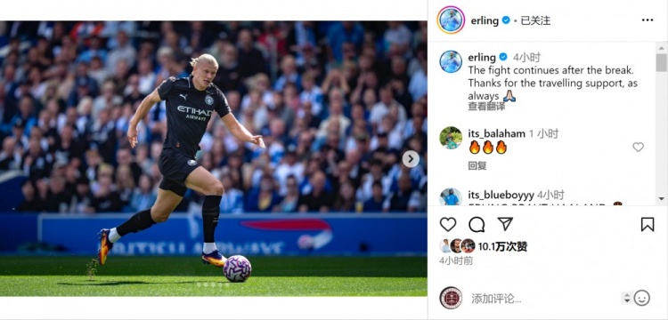 這是哈蘭德出戰(zhàn)的第100場(chǎng)英超比賽,他取得進(jìn)球,但曼城落敗,賽后哈蘭德在社交媒體上寫道:“休賽期后戰(zhàn)斗繼續(xù),感謝球迷在客場(chǎng)一如既往的支持?!?/p>