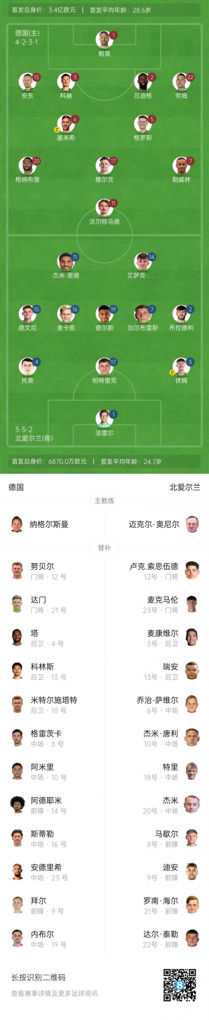 09月08日訊 北京時間02:45,世預(yù)賽歐洲區(qū)小組賽A組第6輪,德國主場對陣北愛爾蘭,賽前首發(fā)陣容出爐!