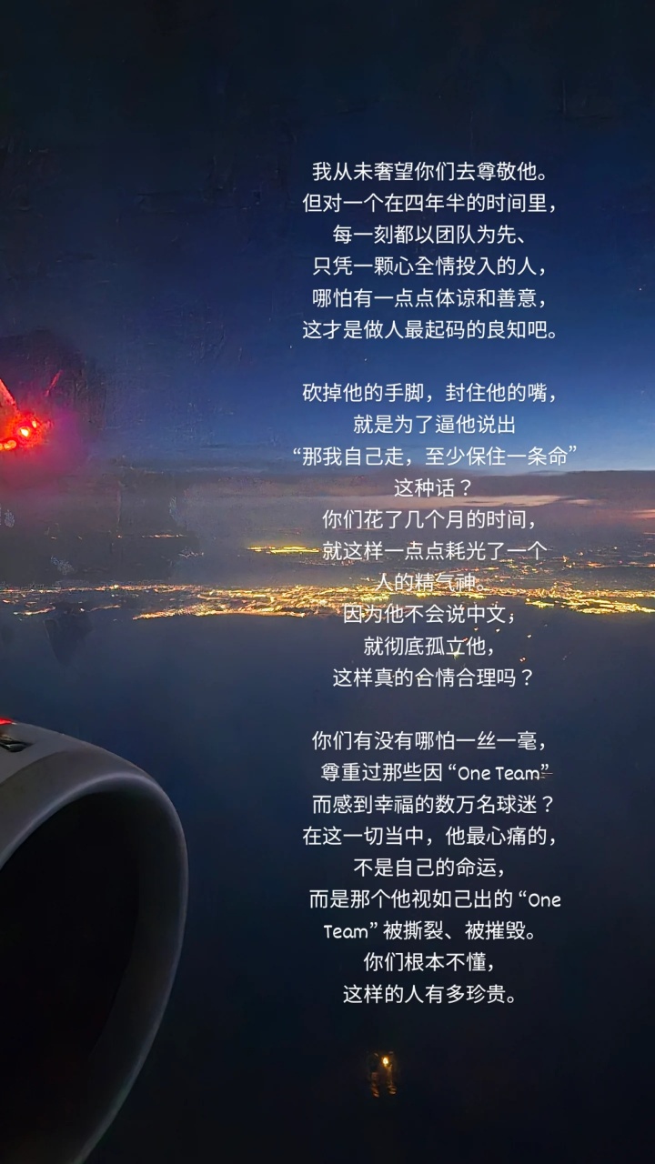 你們有沒有哪怕一絲一毫,尊重過(guò)那些因“One Team”而感到幸福的數(shù)萬(wàn)名球迷?在這一切當(dāng)中,他最心痛的,不是自己的命運(yùn),而是那個(gè)他視如己出的“one team”被撕裂、被摧毀。你們根本不懂,這樣的人有多珍貴?!?/p>