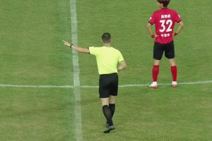 第35分鐘,淮安隊(duì)外圍嘗試遠(yuǎn)射打高?!?/p>