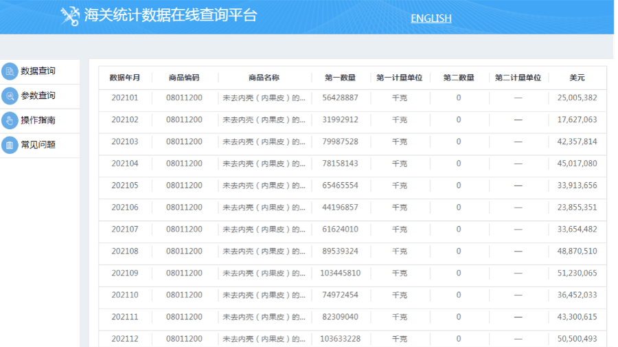 2021年我國未去內(nèi)殼(內(nèi)果皮)椰子進(jìn)口數(shù)據(jù)。(網(wǎng)頁截圖)